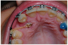 شکل- اتصال زنجیر طلایی به دندان نیش نهفته و وصل کردن زنجیر به سیم ارتودنسی براکت برای بیرون کشیده دندان نهفته صورت میگیرد.